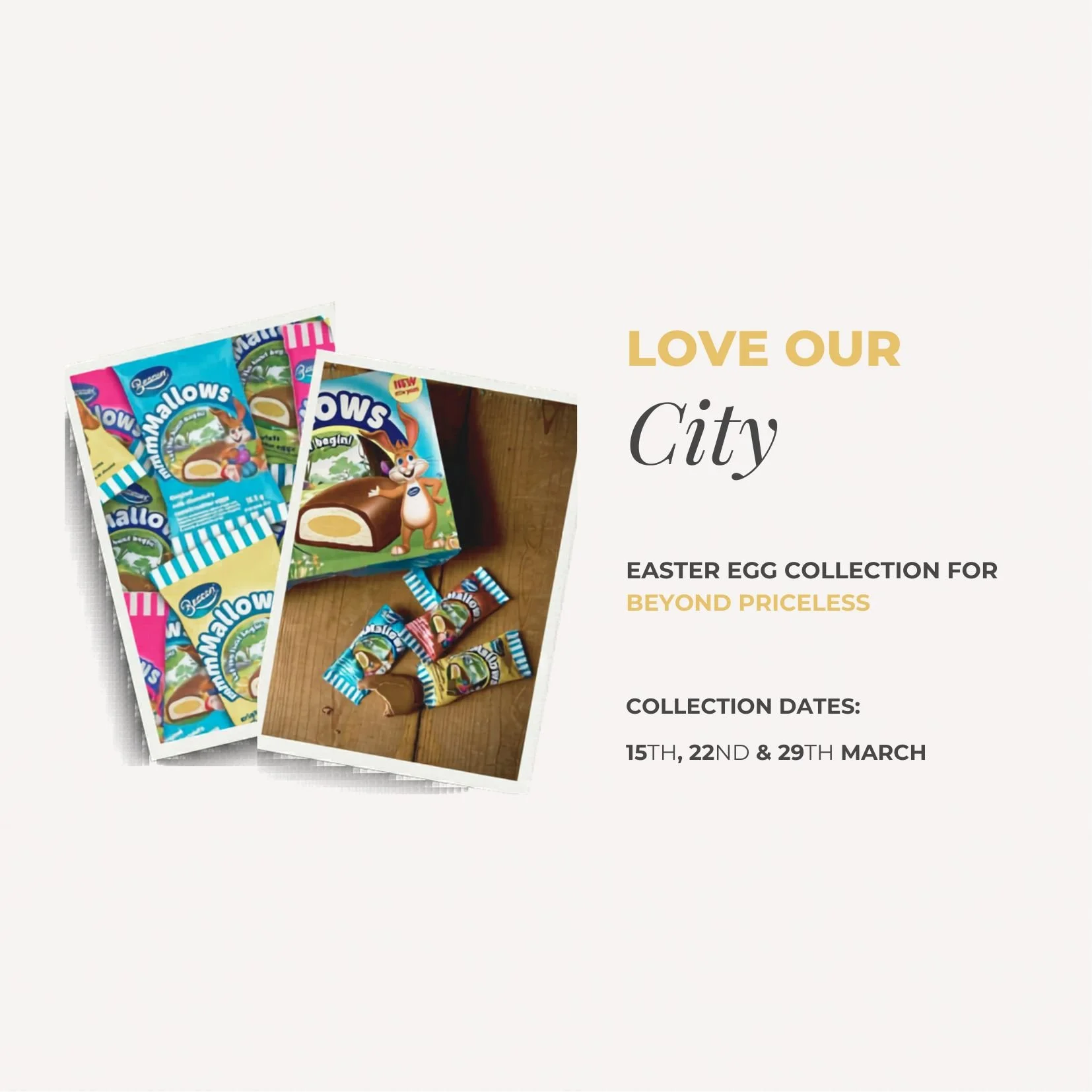 As we head toward Easter, we have a beautiful opportunity to Love our City in a very tangible way. This month, we are partnering with Beyond Priceless to collect Easter eggs. Beyond Priceless is a counter-child-trafficking organisation dedicated to protecting vulnerable children and restoring hope. Over the next three weeks, we’d love for you to bring a box (or two!) of marshmallow Easter eggs to church on a Sunday, or drop them off at the Church Office during the week.